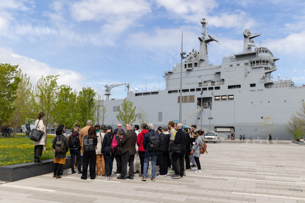 Les participants se sont arrêtés le long du corridor cyclable VivaCité à la Place des Cantonniers et à la rue Dalhousie pour en apprendre davantage sur la mise en œuvre d’infrastructures cyclables à un endroit qui faisait face à des problèmes de sécurité routière liés à la cohabitation – et aux conflits potentiels – de divers usagers, y compris les cyclistes, les piétons, les automobilistes, les touristes et les activités liées aux quais. À titre d’exemple, l’ingénieur Jérôme Nadeau a montré où l’itinéraire cyclable initial passait le long du quai, mais le chemin était souvent bloqué par des passagers montant et descendant des navires de croisière; ce jour-là, un grand navire militaire était à quai. La piste cyclable a été réaménagée pour suivre un itinéraire parallèle au quai, mais s’en éloignant.